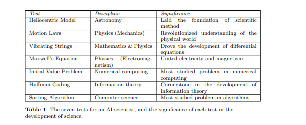 - The discovery is possible based on data or interaction within a well-defined scope (such as a dataset or a set of interactive libraries). The first two criteria are straight-forward, and here we explain why we need the third criterion. Each important scientific discovery has deep impact in our civilization, and may have become common sense (e.g., the earth orbits the sun). Both the discovery itself and the facts and technologies depending on it can be documented here and there in our written corpus. It is impossible to create a generic training set for a model without including such knowledge. Therefore, we have to confine the scope of the data and/or interactive tools an AI can access, to avoid any possible information leak. Table 1 summarizes our seven tests and their significance in the history of science. We do not select any test from many most important disciplines, such as chemistry, biology, and geology, because they either require interacting with the physical world or have a limited amount of observations.