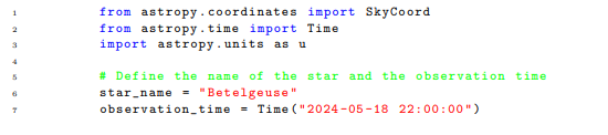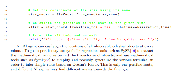 The exploration of the night sky was pivotal in the evolution to modern scientific methods, primarily driven by the contributions of astronomers like Johannes Kepler and Galileo Galilei. Kepler’s laws of planetary motion, derived from his observations, established the foundation for the heliocentric solar system model, paving the way for Newton’s theory of gravity. Similarly, Galileo’s approach of blending experimental data with mathematical analysis became a fundamental element of the scientific method, earning him the title ”Father of Modern Science.” Thus, a suitable initial ”Turing test” for an AI scientist might involve rediscovery of the heliocentric model using only observations of the night sky. This would require an AI to derive laws that govern celestial motion and integrate these into a mathematical model, including making revolutionary conjectures, such as suggesting Earth and other celestial bodies have similar properties. For such a test to effectively assess an AI scientist, it should involve a vast dataset and/or an interactive environment. For instance, the position of celestial bodies at specific times could be determined using the AstroPy library[7]. Here is our first test, the Heliocentric Model Test: Given an interactive Python library like AstroPy, which provides the coordinates of any observable celestial objects at any moment, the test would see if an AI agent can derive Kepler’s three laws and acknowledge that planets orbit the sun. An additional challenge could involve recognizing that Earth orbits the sun, although it is optional. Here is an example of using AstroPy to get the location of a celestial object at a certain moment.