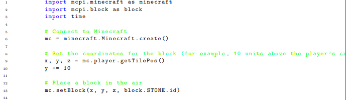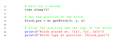 Our second test, Motion Laws Test, aims at rediscovering the fundamental principles of motion. It is non-trivial for an AI agent to interact with the real world objects. Fortunately the virtual worlds such as Minecraft offers a platform for exploration in kinetics. This test would assess the AI’s ability to derive the Law of Inertia, and the Law of Acceleration under the influence of gravity, solely from interactions and observations within the game and a few mathematics tools such as PySR and SymPy. In this test, the AI would need to manipulate and measure the dynamics of various objects under different conditions within the game. For example, the AI could alter the mass of blocks, apply forces, and observe the trajectories. By analyzing these observations (using tools such as PySR and SymPy), the AI would need to derive the formula corresponding to the Law of Inertia and the Law of Acceleration due to gravity. One can use Minecraft: Pi edition API Python Library[10] to control objects in Minecraft in Python. As shown in the example below, one can set a block in the air and observe its position after one second.
