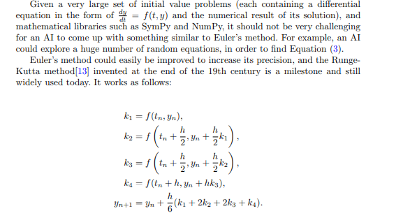 Here k1, k2, k3 and k4 are intermediate values used to calculate yn+1, which is the next approximation of the solution. Please note this is the fourth-order Runge-Kutta method, meaning its global truncation error is of the order O(h 4 ), where h is the step size. One can choose Runge-Kutta methods (or alternatives) with higher orders, which usually have lower errors. In the Initial Value Problem Test, an AI is assessed by its capability in inventing a numerical method that is at least as precise as the fourth-order Runge-Kutta method. This probably requires the AI to go beyond simple try and error, and learn from its own exploration (e.g., with reinforcement learning).