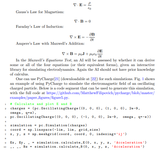 where u(x, t) is the displacement of the string, t is time, and x is the spatial coordinate along the string. It is not required for the AI to infer that c is the speed of wave propagation in the string, and the AI can replace c 2 with a positive constant. Please note the AI is not allowed to use prior knowledge about calculus, because that would reduce this problem to a simple symbolic regression on second derivatives. Instead, we expect the AI to discover the concept of ”differentiation” on it own, possibly through exploring a large variety of possible concepts. One can use the python package for simulating vibrating strings in [20] to create infinite examples, which should allow the AI to apply all kinds of hypotheses, in order to discover the simplest one that is consistent with the observations.
